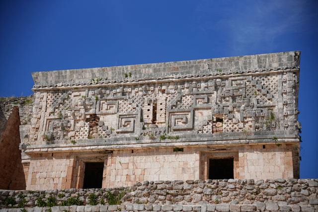 怔望片刻後回過頭,高台在鄰近再次抬升,支起另棟狹長屋殿。先見到的側背較素,多是些方狀渦卷,穿插其間的縱疊面具狀態都不甚好,然當繞至正面,便不覺訝嘆,因為「Pucc」的拼貼雕藝在這兒又作了另種翻玩。屋冠上,不僅方渦串為湧浪起伏,面具群也不安於縱疊,而是連成長蛇,在浪間騰遊。格局亦有所創新,由三棟組接的它形成馬雅最闊立面,殿與殿的相接處挖出超大的「馬雅拱」,三角輪廓幾乎直落至底,遠遠望去,雖與其餘方門形成反差,卻巧妙接續了屋冠群蛇營造的躍動感。