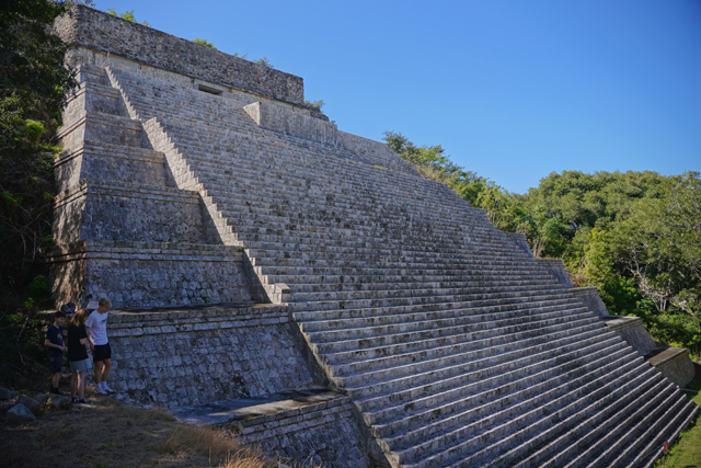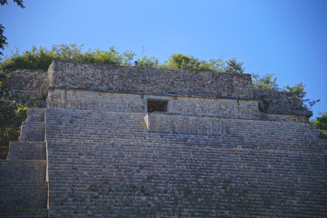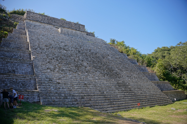 本以為拍照完就會朝那推進,哪曉得團員們便坐著聊開,於是不想讓時間空轉的我就自己下去了。瞥著沿途幾座崩頹的小屋,我走到這「大金字塔」前,其階路拉展得相當闊,幾乎可說是整立面,修整得也好,可惜依舊禁爬,只能仰望。無從知曉頂廟屋冠本來有什麼,可見的堆石應是維修後的成果。牆面倒是一反先前幾座的留白,充斥著方渦卷,並在間隙填以X或花團,彷似「Chenes」風格的引用。