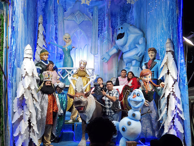胡亂逛了一圈,瞄到很妙的一區,它們是整排的場景屋,供付費民眾拍照。炫麗或知名的場景排隊人龍都很長,如佈置得金光爍閃的「馬槽降生」,員工還會穿三賢者衣裝增添氣氛。《冰雪奇緣》的人氣也相當高,背景仿冰宮,兩姊妹人偶就是超強的招財貓。主題冷門或排場普通的便門可羅雀了,這很合理,都撒錢了當然要挑CP值高的。