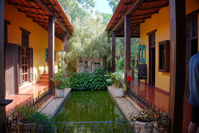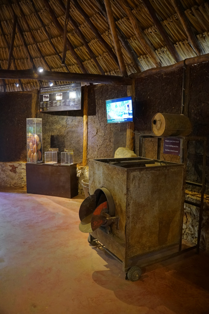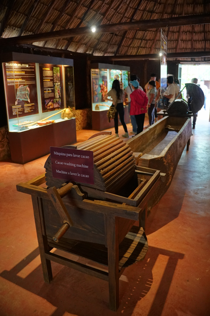 博物館跟想像不太一樣,當穿過頗具風情的中庭、與水池相映的簷廊,內裏竟通往叢林。導覽員是個帥氣小夥子,經他簡介,看來展廳們就在林間,以環道串連。循路行去,展廳應景地以茅屋形塑,本以為就是些看板,沒想到搭襯的物品還滿豐富。第一間以貿易作開場白,一張圖板顯示了馬雅各地物產,主角自然是可可豆了,它盛產於東邊「加勒比海」灣口,南邊太平洋海岸,重要程度可與玉、黑曜石、翠羽相比擬,甚至還成了一種貨幣。