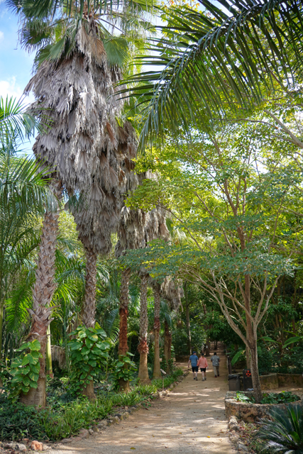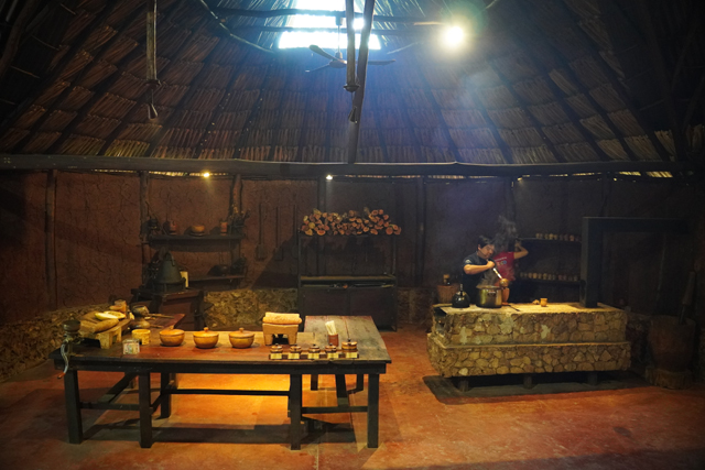 除了蜘蛛猴、林間尚能看到美洲豹、鹿、鱷魚,幾條岔路意謂還別有洞天。不過接續得搭飛機到「墨西哥城」不能遲到,就通通無視,快速穿過無亮點的馬雅住家示意,來到可可的試飲廳。它煞費工夫弄得像附有座席的劇場,長桌展示了前置作業,旁邊石爐用來煮泡。我半放空地聽完講解,隨大夥上前領了一杯,怎料剛熬出來的濃可可苦得恐怖,於是又趕緊加了一堆糖,有甜度果真才對味。