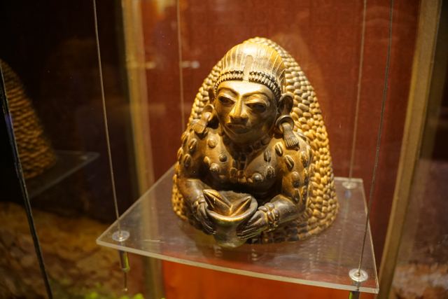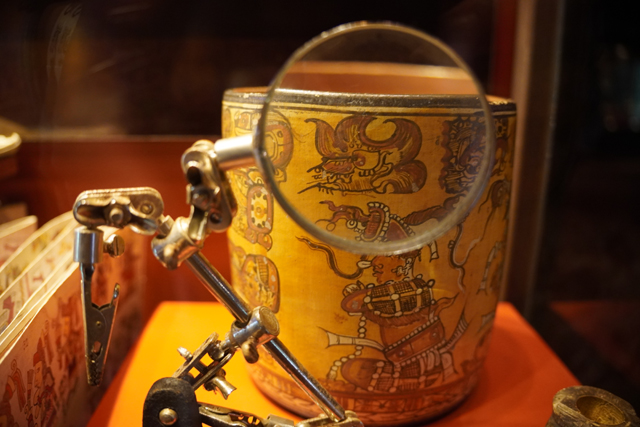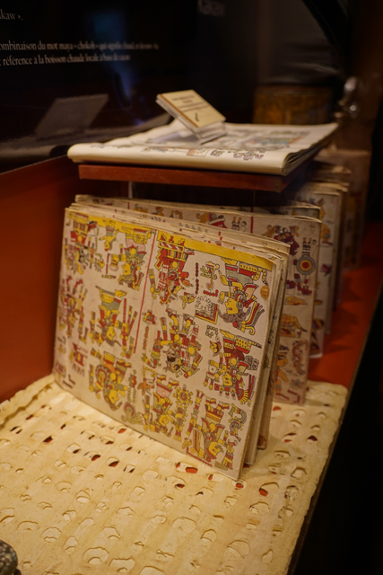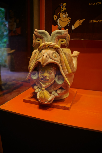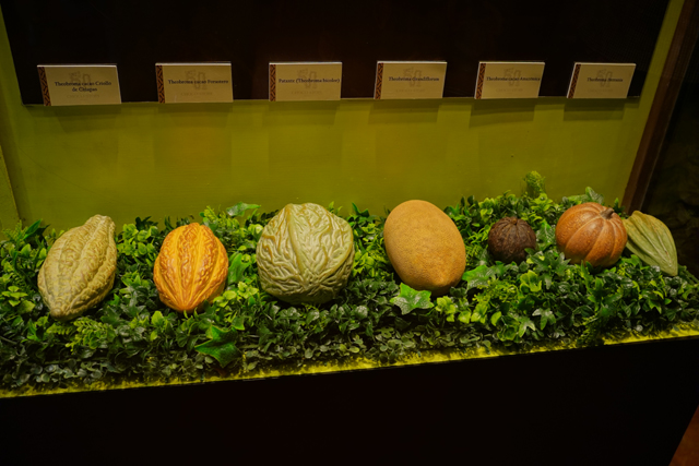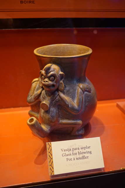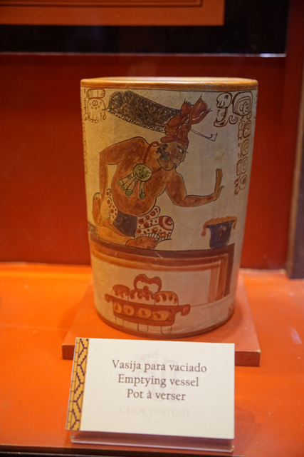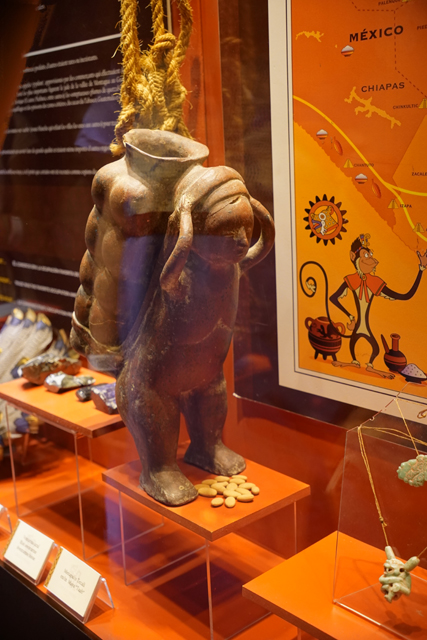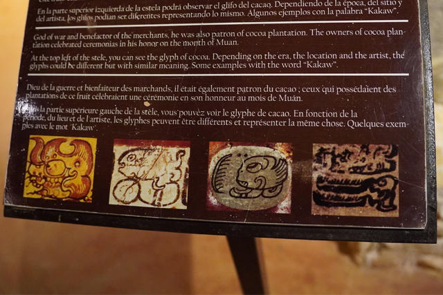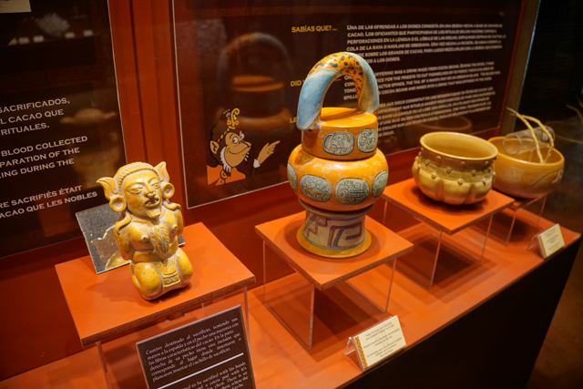它的歷史也相當早,據說從公元前兩千年,當地人就知道怎麼藉其調配出飲料,且手法日漸精進。烘烤、研磨,並在加水稀釋後吹氣搖晃,以泡沫增添風味。由於馬雅貴族著迷到恨不得每日都能狂飲,相關文物也多。廳中央便有來自「Bilbao」的石碑,它以比賽完的球員為題,頂部太陽神現形,側邊一人雖已斬首,手還高舉著。而勝者朝天奉祭的物事挺奇特,心臟外形,卻有著五官,字板將其解釋為可可豆的擬人化,彷彿比人之血肉還珍貴。