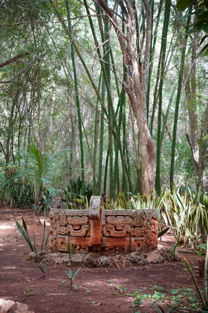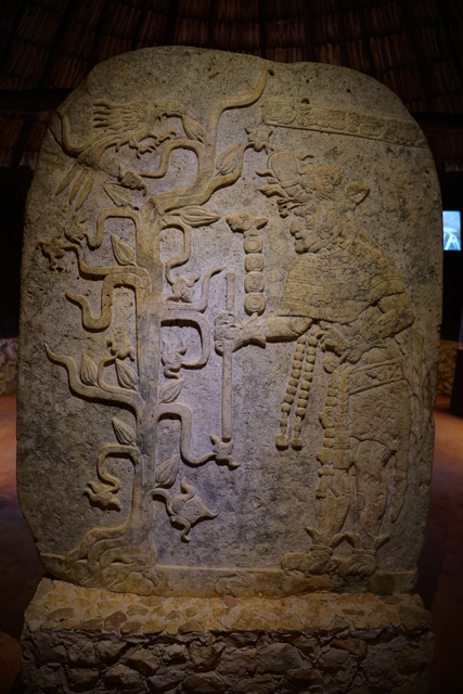 另塊石碑呈現了華裝老人,它是戰爭跟商業之神,也守護可可豆的栽植,畫面左邊便有樹果的茂盛生長跟大鳥的偷吃。而由於乾季結束採收完可可豆,便是適合播種玉米的雨季,一尊飾著豆莢的玉米神也展示了兩者的相依。捧豆的小雕像就更多了,連囚犯胸前也有相關紋路,說是因為可可鹼能令人進入甘願被獻祭的狂熱。