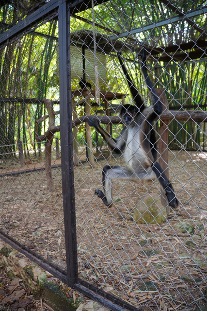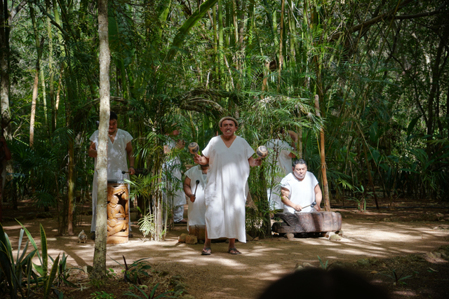 逛完出去,外頭籠內豢養了蜘蛛猴蹦蹦跳跳,大夥好奇以相機招呼了片刻,剛好這兒馬雅儀式的表演將屆,便順勢轉入敞廳等待。我望向林前場地,那兒備了雨神面具形樣的小祭壇、雕著人物的立鼓、兩塊刻有紋路的方木,頗令人期待即將鳴奏的響樂。