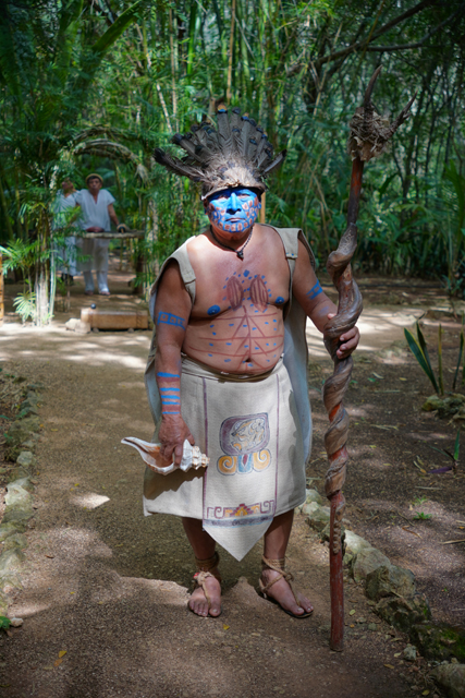 哪知,當開演後,就僅於立鼓與方木單調敲打,主角搖著沙鈴,沒多少節奏變換,吟唱的旋律也枯燥,或可說只是種唸誦,毫無起伏。呃,馬雅建築、美術的成就這麼高,音樂卻僅僅如此嗎?還是在西班牙的文化扼殺後,出色的旋律都失傳了?一同亮相的胖老頭也令我失望,見他頭戴羽冠手持獸角杖,臉身又上了彩繪,以為是個祭司會跳舞,結果他啥都沒幹,就只是送往迎來啊。