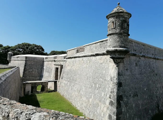 解決了伴手禮,隨隊從「烏斯馬爾」前往西南方的「坎佩切」(Campeche),它是同名州的首府,由西班牙征服者在十六世紀建立。跟「梅里達」類似,其前身也是馬雅城,名為「Ah Kim Pech」,據說有多達三千的建物。然既成了首府,可想而知被大幅拆毀,沒多少餘剩。較特別的是,當年英國、荷蘭眼紅西班牙在此坐收的利益,勾結海盜襲擊,導致這城請法國工程師修了超過兩公里的環牆與八個堡壘,還因此被收入世界文化遺產。而當中的「Fort San Miguel」很微妙地轉生為考古博物館,有不少馬雅文物可看。