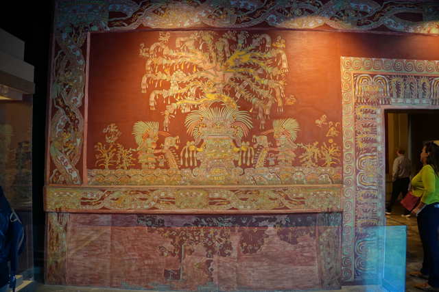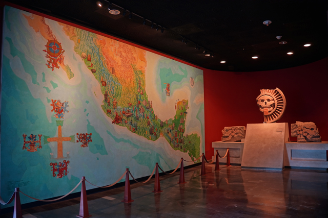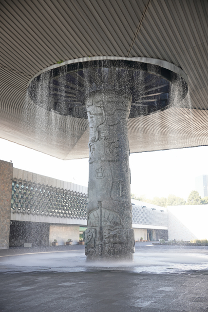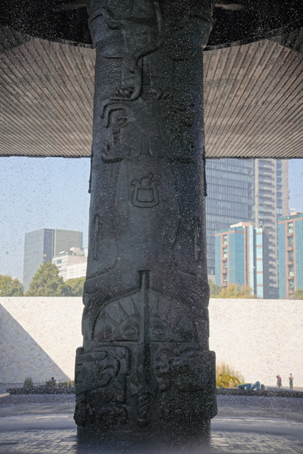 下車後隨大夥走進,其外觀頗為現代,十個展館圍著廣大中庭,當中立了個傘狀造景,傘緣成瀑。當趨近細觀,會發現傘柱其實是世界樹的化形,頂頭有國徽中的食蛇老鷹,樹幹浮透宛如雙生的原住民與西班牙人。樹根的鷹豹對峙應是來自馬雅,據說也象徵宇宙的對立元素。持劍的太陽臉就難參悟了,不知源於哪個傳說。