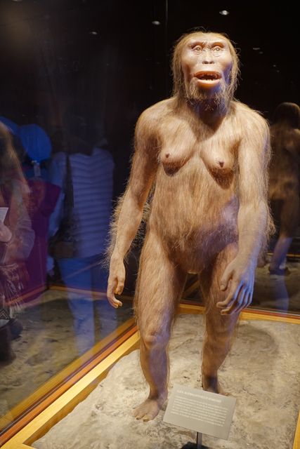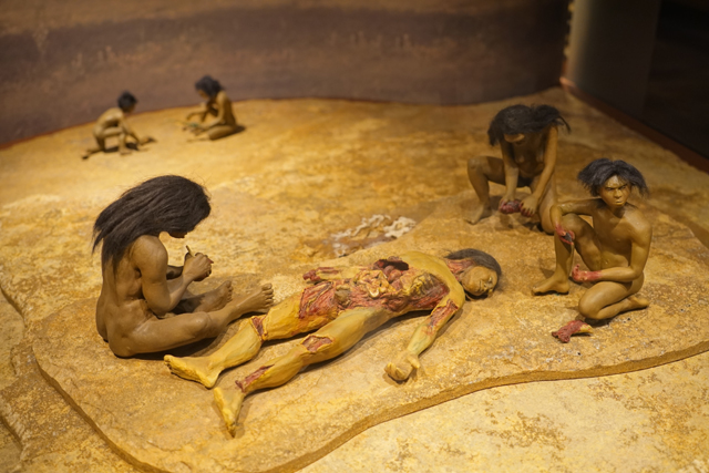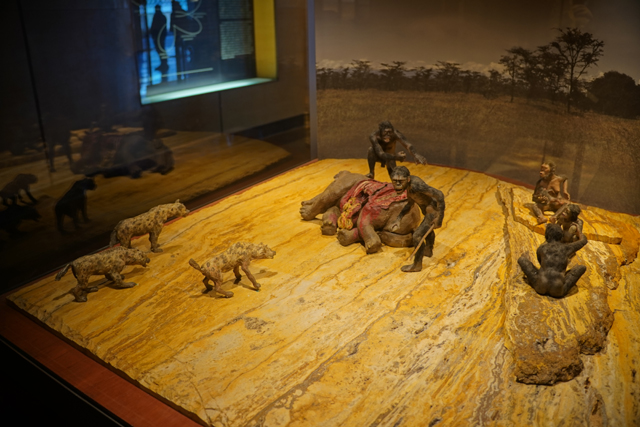 盯望些許後,大夥循館方設計的逆時針路線,由右側第一館看起。它講的是「人類的起源」,散點著模型,先跟我們打招呼的是三百萬年前來自非洲的「露西」,經過想像復原的她屬於「南方古猿」,已能憑雙腳行走。在周邊點綴的是各樣微縮場景,描述進化為「智人」的歷程,把同伴吃得血肉模糊的挺驚悚。