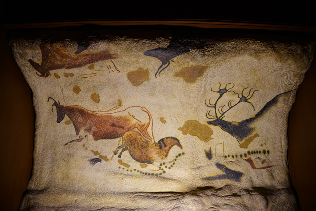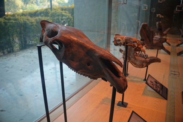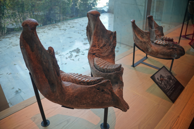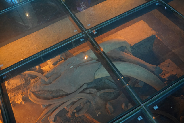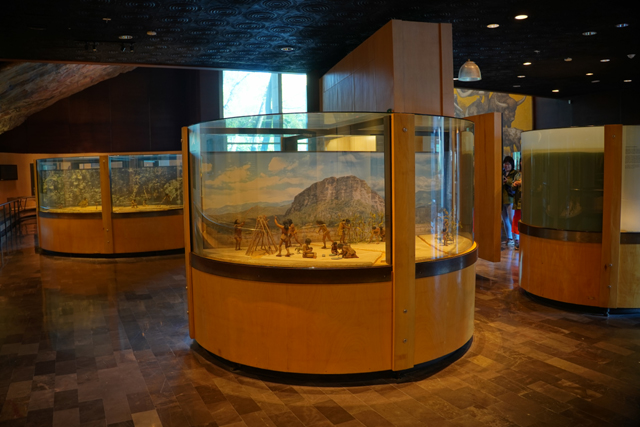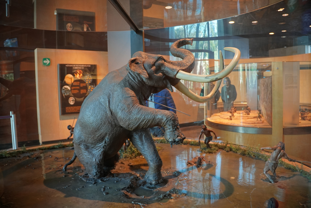緊鄰的第二館「美洲聚落的發展」同樣有不少微縮場景,像可憐的猛瑪被圍著擲矛獵殺,伴隨的,是「更新世」的諸多動物化石。或許知曉遊客會嘀咕僅幾根骨牙難推想,牆上懸掛了大幅想像圖,猛瑪為核心,乳齒象、大地懶、劍齒虎在旁陪襯,威風凜凜。馬、熊、駱駝看起來就與今日的滿相似,好可惜這些奇妙動物都因氣候變遷跟捕獵而絕種了啊。人類相對而言比較厲害,漸漸從採集狩獵轉往農業。