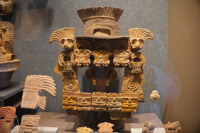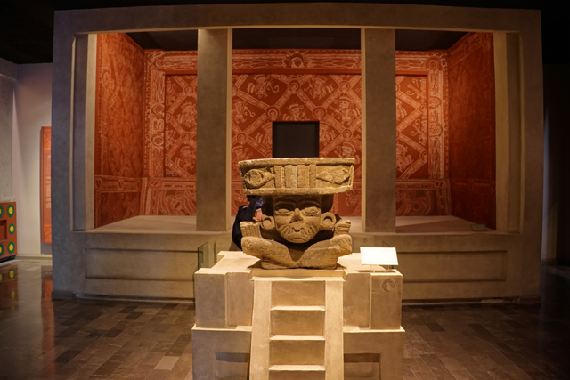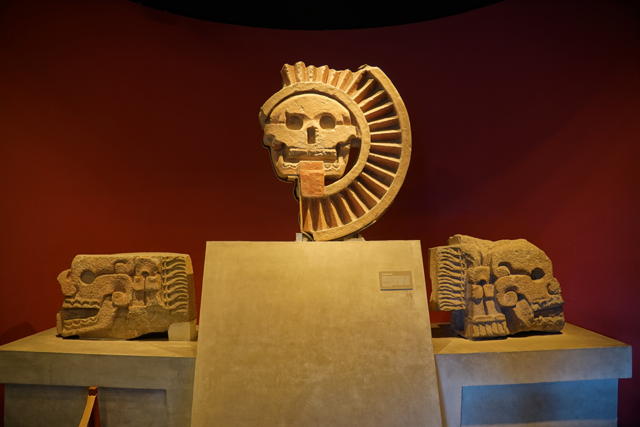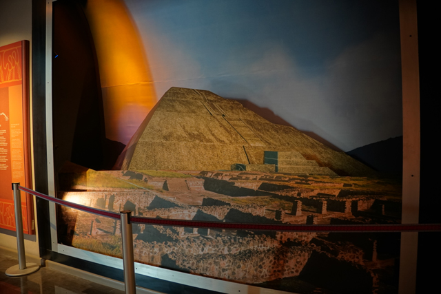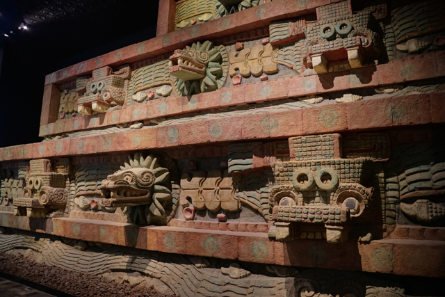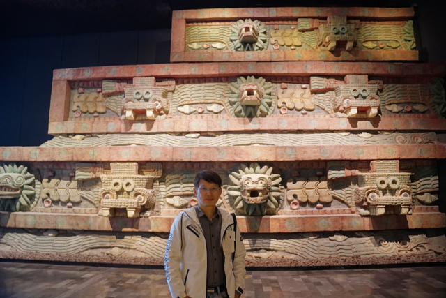 快速以相機記錄過,趕回「特奧蒂瓦坎」,被置於起點的是鑲於太陽圓盤的吐舌骷髏頭。它一度飾於「太陽金字塔」,刻著冥界「Mictlan」的死神「Mictlantecuhtli」。再轉個彎,空照模型、金字塔造景接連,勾勒這始於一世紀卻在七百年後被棄的壯偉謎城。最醒目的是「羽蛇神廟」的部分複製,塔面有雕鑲重複疊列,脖子環羽如花的為羽蛇神,大眼睛大鼻孔的是雨神「Tlaloc」,之間穿插上色羽鱗跟貝殼。雖然旅程末我會加碼去實地看,原物不免殘缺,眼前這座算省了編想功夫,展現本該有的堂皇貴氣。