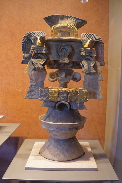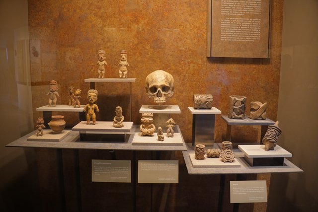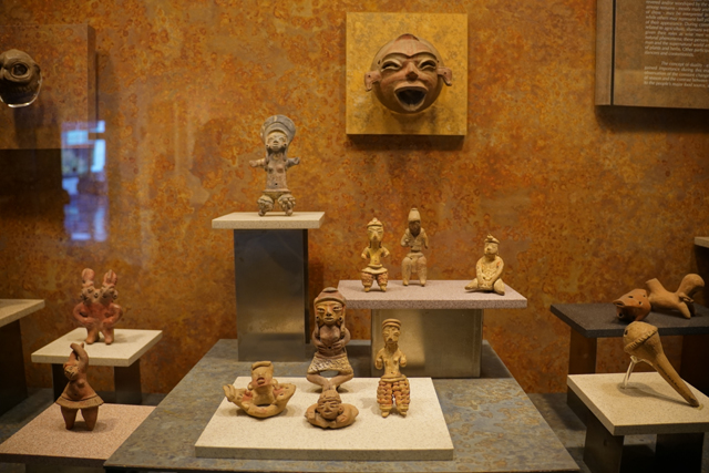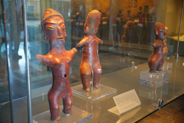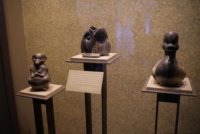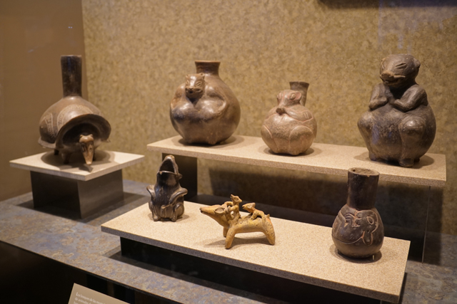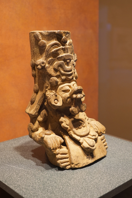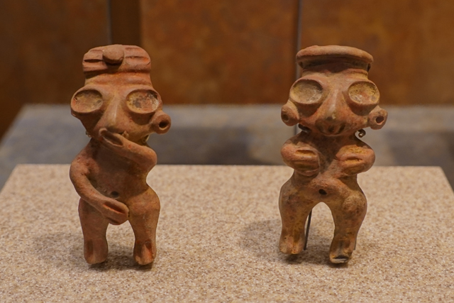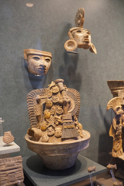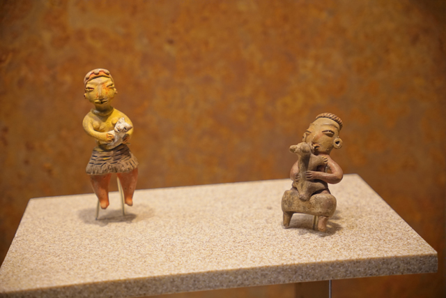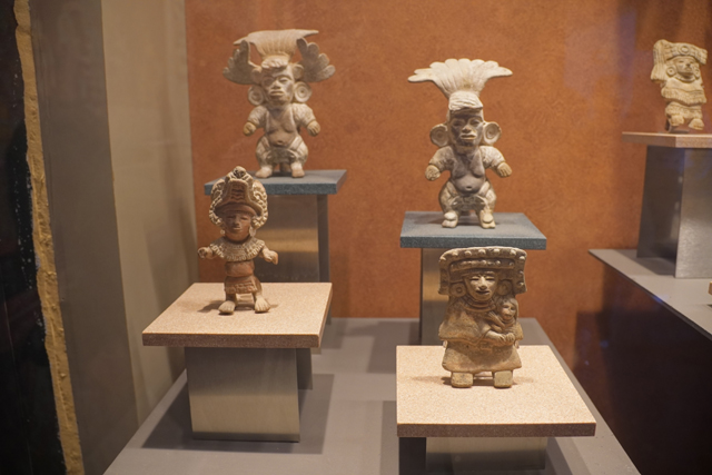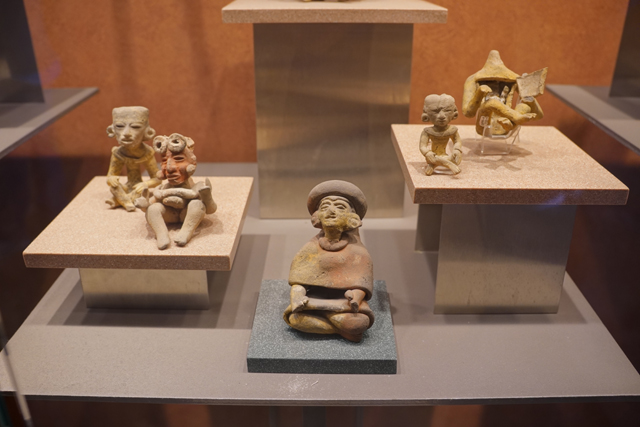 另一大宗是小人偶,不太清楚是用來祭祀還是捏高興的,歪斜五官、傻愣神情透著童趣,遮著嘴巴的莫名像非禮勿言。有婦人抱著嬰兒、親吻小狗、張腿準備臨盆,也有祭司衣裝別緻,留印了當時流行。由於跟靠海的「奧梅克文明」同期,有些似也受其知名大頭影響,能看到臉頰鼓鼓的娃娃、趴著把腿反凹至頭的軟骨功小胖。