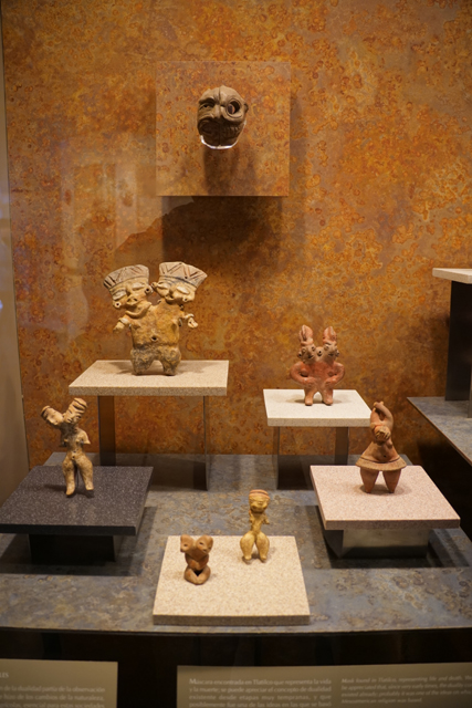 快速繞過後,下兩館是連體嬰,隊伍帶往的雖是重點的第四館「特奧蒂瓦坎」,不想錯漏,聽了片刻,我就還是自己拐去第三館。它展列著公元一百年前的「前古典時期中央高地文明」,看地圖是指墨西哥中部,這兒的盆地得天獨厚擁有大湖「特斯科科」(Texcoco),往南延伸至「Xochimilco」和「Chalco」形成綠帶。不少展物來自湖西的「Tlatilco」,即便是鍋碗杯盆,已有了魚、鴨、犰狳、浣熊的化形。