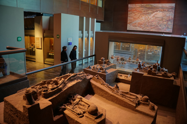 較難懂的是,這之間雜了猙獰面具、結合兩種動物的臉譜、一堆雙頭人,總不可能是當年的寫實表現吧?只能自己胡亂以宗教歸結,畢竟很多文明不乏有陰陽同體,善惡同源的創作。相形之下,附屬的一大區骨骸墓穴復原就因無記憶點而遜色了。