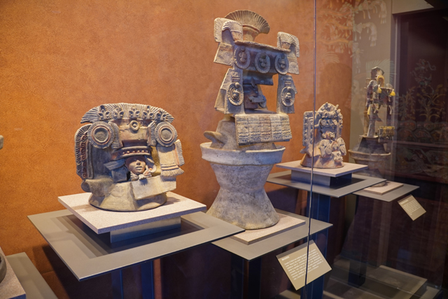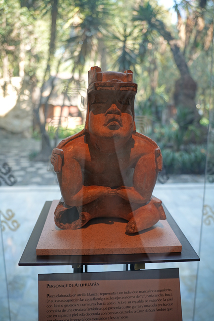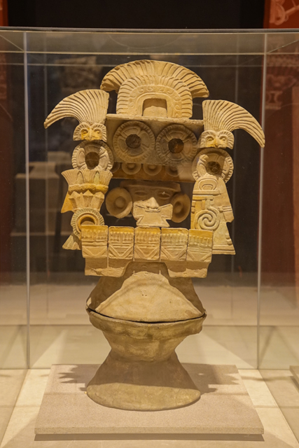 除了馬雅文物,牆面兩幅筆觸粗獷的「飲酒人」來自南方的「Cholula」,為行程末尾我自助的目標之一。更遠的「Oaxaca」也因貿易、雲母開採,在城內發展出社區「Tlallotlacan」。一尊「Cocijo」神像擁有其都城「阿爾班山」的元素,高帽跟大型鼻飾風格別具。