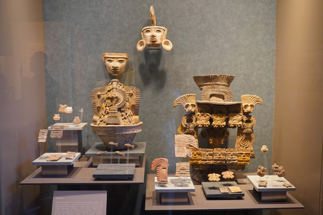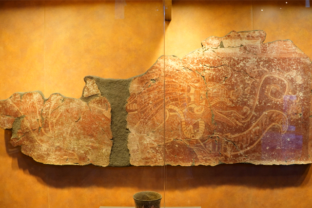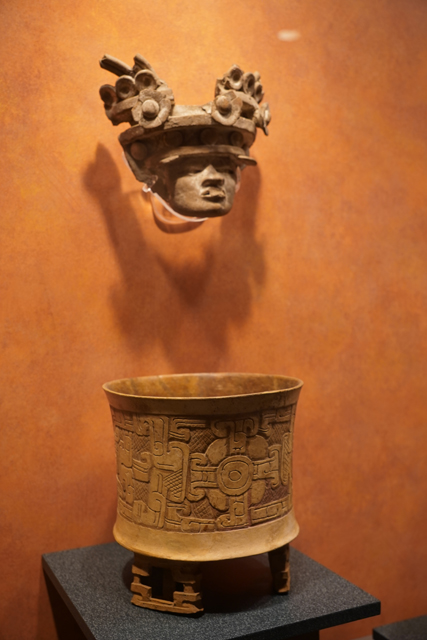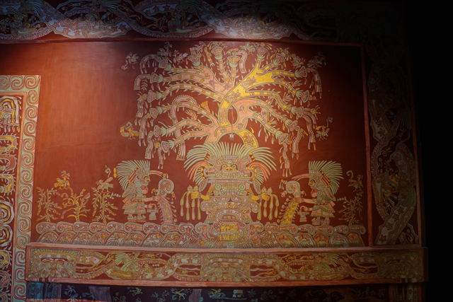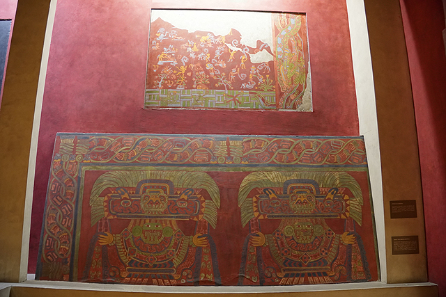 她背後為宮殿「Quetzalpapálotl」的還原,此名組合了羽毛跟蝴蝶,源於宮內的支柱雕刻。不過在渦流的框繞間雖能見顯明鳥身,蝴蝶卻難辨,該不會是抽象化了?盯望中朝裡走,展櫃有些面具、人臉化的杯壺雕板、幾幅壁繪殘塊。可能是還沒輪到它們的標牌製作吧,只先附上簡述,提及「特奧蒂瓦坎」最常描繪的,是雨神前身「風暴之神」,其吐出的睡蓮象徵繁衍,分叉舌代表戰爭犧牲。