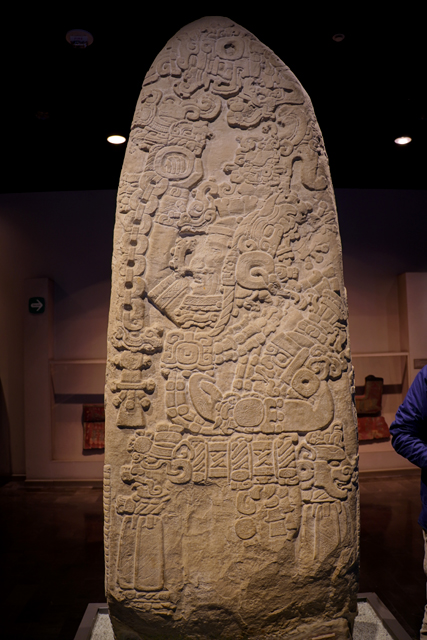 然這廳其實主講「特奧蒂瓦坎」跟別城邦的來往,不可避免提到了馬雅,說「太陽金字塔」找到的諸多玉器,很可能都來自於那。「提卡爾」的「Stela 31」很奇異地出現在此,不曉得是否為外借。它正面刻了「暴風雨的天空」高舉鍊冠,父親「捲鼻王」在頂頭跟側面連結「特奧蒂瓦坎」的遠征,能見標誌性的擲矛器跟「Tlaloc」盾牌。背後是整面的方塊銘文,老師很自然又開始通靈,講了一遍將軍「火之生」領兵至此,促使「捲鼻王」與馬雅血脈的融合。