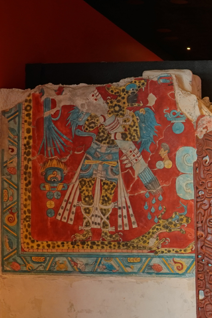 而被複製於展館的是宮裡的另處門牆,左側豹裝男子立於斑點四腳蛇上,因拿著滴水長矛可能意指雨神。右側的一身鷹羽,腳踩羽蛇,手持蛇杖,以玉米的滋長對應農業。不得不說當盯望著,很難想像不是出自馬雅人之手。