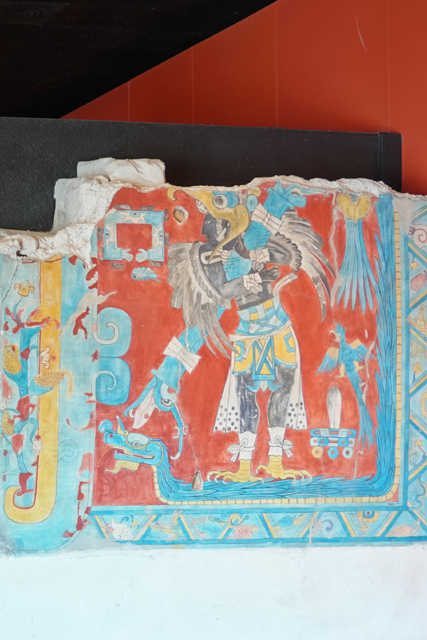 由團員錄下的影片看,整宮區雖為保護壁畫以鐵皮屋罩覆,滿煞風景,彩繪是的確精湛。當中的長幅戰爭畫最為知名,因為明明離馬雅千里遠,卻呈現了相似風格。勝軍身著美洲豹盔服被推測是當地人,倒地被屠的鷹戰士們臉部特徵很馬雅。真的有這麼一場戰事嗎?學者們挺懷疑,只能先歸結為日夜、旱雨的對立轉化,或領導階層的政治宣傳。