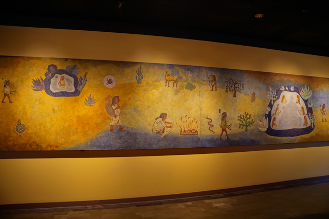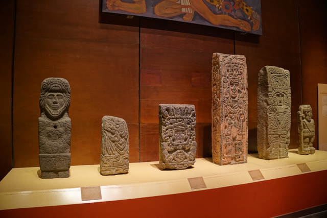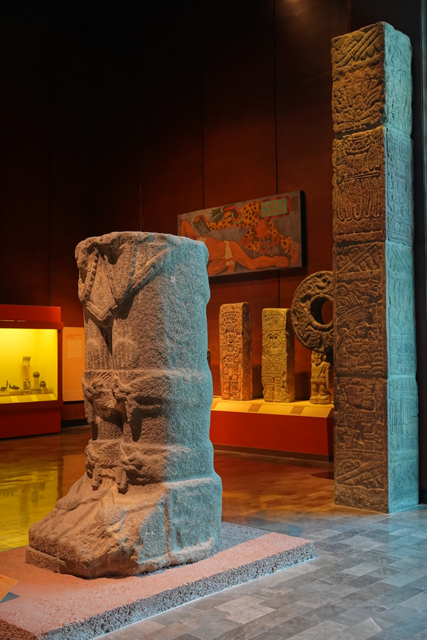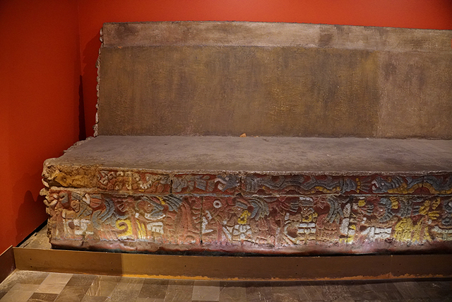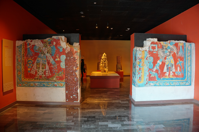 周邊為世界遺產「Xochicalco」的展物,兩根雕柱分別刻著雨神及從蛇嘴探頭的羽蛇神,諸多的武器藝品間,能見浮透蝙蝠臉爪的大鍋。屋冠的灰泥裝飾尤為特別,乍看像抽象的飛揚龍角,其實是飛鳥的仿擬。