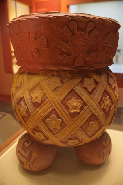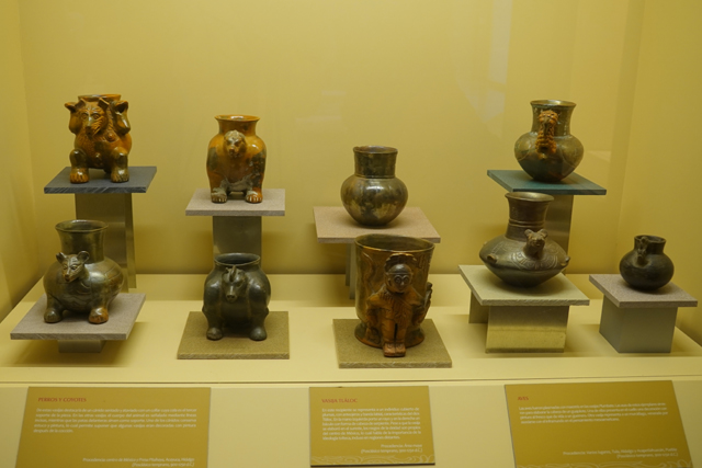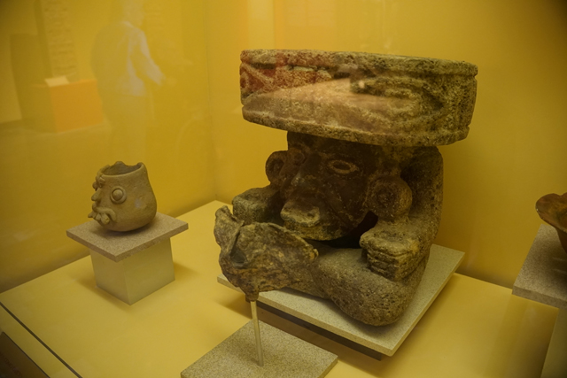拐個彎,展館末尾補了幾個較次的城邦,像是被「托爾特克」進佔後的「Cholula」,作為代表的是座微縮金字塔,能見陡階通抵小神廟,簷下殘著骷髏頭彩繪。鄰近尚有別致香爐,圓球為腳,刻綴著金星與老鷹。「Tenenepanco」也佔了一席,他們崇尚火山,將其視為水的容器,會在山坡祈雨,因之而生的雨神臉長瓶頗趣致。
