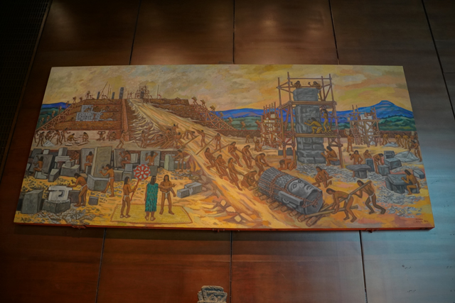 快五公尺高的它們本是神廟支柱,很令我在仰望中揣想,畢竟走了幾天,見過的屋堂都不算高闊。而相比「奇琴依查」方柱的戰士淺浮刻,這幾根因是圓柱更趨向人形,高冠、擲矛器、象徵火焰與重生的蝴蝶胸飾,轉至背後,還有嵌著人臉的太陽圓盤。究竟是怎麼搬上塔頂的呢?學者至今仍眾說紛紜,最可能的應如牆上繪想所示吧,先堆築土坡,再分段拉上去組裝。