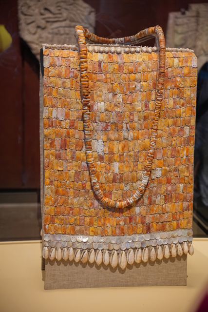 除了建築裝飾,幾樣藝品進一步展露了他們手工。其一是郊狼頭盔,真骨為牙,珍珠貝拼組成狼毛及人臉,維妙維肖。另個遠望像時尚的提袋,其實是貴族彰顯身份的胸甲,邊緣綴著「Olivella」這種貝類,甲片來自斑紅的海菊蛤,艷麗的色澤招著大家圍觀許久。