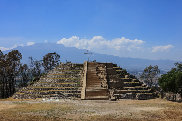 複製門後,被置於視覺焦點的是「Xochitecatl」的創造神,有著鬚面獠牙。這遺跡跟「Cacaxtla」只隔了小山谷,通常會順道同遊。相對後者的政權地位,它因位處死火山成為信仰中心。目前可見的刻鑿雖不多,仍能攀上奇特的螺旋步道圓丘,經蛇形雕刻建築、火山平台,至祈求生育的「花金字塔」一覽廣闊山野。