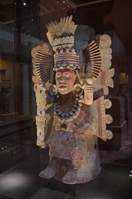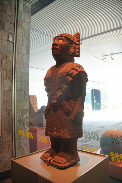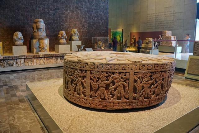 在入口顯眼的是座美洲豹祭壇,背上孔洞用來裝心臟跟血,有著很繞口的稱呼「Ocelocuauhxicali」。後方的大石輪用途就比較分歧,或簡略以祭壇歸類,或被認為是角鬥士場地「Temalacatl」,人被綁在上面拚搏,至死方休。它表面有著日芒,凹陷心處隱著太陽神臉,可收集人血。側面框邊雕出曆法,框內刻描了十一場征服,也因此被名為「Moctezuma’s Stone」,取自大幅開疆闢土的君王「蒙特蘇馬一世」。這石輪出土於「大神廟」(Templo mayor),即都城「特諾奇提特蘭」核心,順其望去,能見像教堂主祭龕般被懸於中軸末的「太陽石」,它是整館的頭牌,但看隊伍領的方向,顯然是想好酒沉甕底。