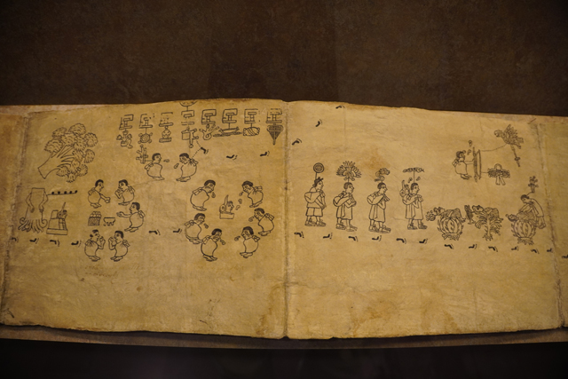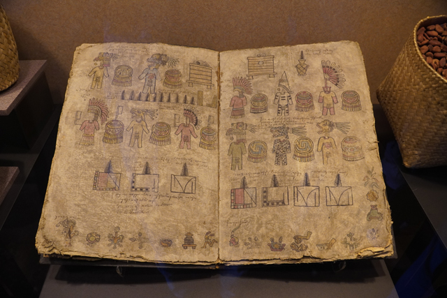 最末近門的展物比較雜,其中雕滿骷髏的祭壇有著特別功能,因每五十二年為慶祝新週期,阿茲特克人會將等數量的木材綑一起,以「新火」之名在被獻祭者身上燒,最後將「二蘆葦」字符埋入。顏色鮮亮不像古物的繪本不清楚是否相關,環繞的年份字符的確是五十二個,打扮華麗的神祇跟一對在壇座行儀的人是在幹嘛,就滿考驗想像力。