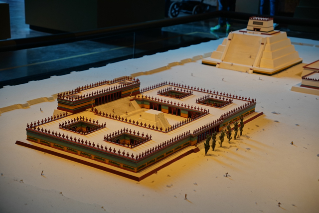 阿茲特克人在犯蠢被驅離後來到「特斯科科」的湖中島,因見到老鷹立於仙人掌的異象,就此定居,並隨時間擴張成巨大的人工島,即之後的都城「特諾奇提特蘭」。據說他們在四角栽植耐水樹種,以木材框出範圍,再用泥土睡蓮填實,順便種玉米。聽來雖不甚穩固,但確實支撐了兩百年的繁華。角落廳間就展示了核心區模型,在牆面佐以湖島鳥瞰圖繪,十三平方公里,六萬餘房屋,望來相當壯觀。