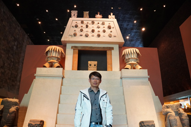 趁隊伍推進前,我趕緊捕捉周邊展物,當中被豎起的祭壇刻有指著自己胸口的戰士,很令人聯想《進擊的巨人》裡「獻出你的心臟吧」。鄰近以剝皮神「Xipe」為題,能見閉眼張嘴的面具雕塑、口哨及血肉模糊的皮衣,亦有以香爐呈現的多層披穿。據說當時戰士真的會剝手下敗將的皮,不管腥臭就這麼穿掛在身臉,頗為噁心。