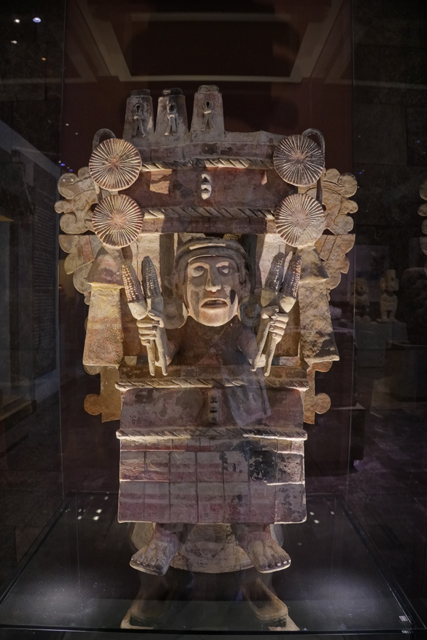 不免也被香爐勾留了步伐,尤其這邊四尊相當龐大。最右的身分挺容易猜,因為額上面具有圈圈眼跟獠牙,佐以腮紅般的圓飾,就算尖盔兩側用摺扇張揚著,手持閃電杖,望來仍舊逗趣。他鄰居「Nappatecuhtli」就沒聽過了,說也是種水神,身兼四地之主,護佑蘆葦蓆製作。造型類似雨神,只是背襯又更招搖。