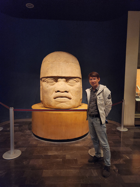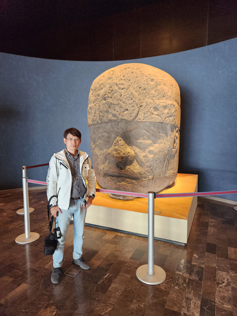 不知為何,這一族很喜歡雕鑿大頭,入口就擺了重達二十噸的一尊,即便沒有誇張頭飾,圓臉、寬鼻、厚唇就輕易形構了記憶點,當盯瞧著也不禁猜想他們是否也都把自己養成小胖子。瞥向說明牌,這尊出土於「奧梅克」第一個都城「聖羅倫索」(San Lorenzo),雖說是都城,好像也沒留下什麼醒目建築,點進Google Map,只找到收納文物的小博物館。即便如此,中美洲常見的金字塔、球場可都是由「奧梅克」發展出來的,獻祭儀式、文字曆法,也都能從它找到淵源。