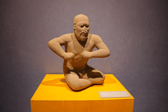 「奧梅克」在三百年後遷都至「拉本塔」(La Venta),當地除了遺下巨大石丘,石碑、文物也相對多。展櫃的一組作品頗為特別,背景插上六根銘文石碑,主角是十六名祭司相互聚圍。跟概念裡祭司總一身華服不同,這群人光著身體,像外星人般有拉長額頭,令儀式莫名散著邪異風。