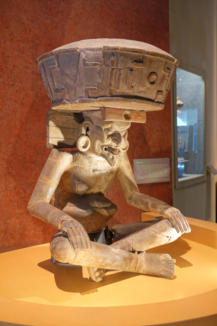 年代於此順勢進入「古典期」,神祇雕塑也變多。熟悉的雨神又戴著圓圈眼飾出現,蛇牙外顯,腿間不知為何以尖錐強調雄風,加上周邊飾片很像螺旋槳。鄰近的祖先神倒沒什麼變,依舊是標準的老人臉,頂著巨大火盆。