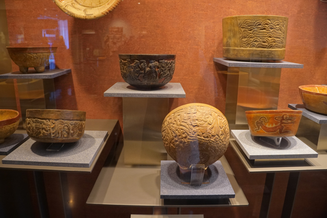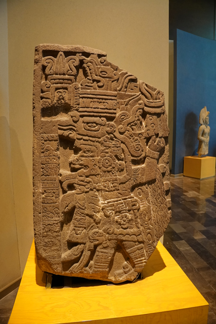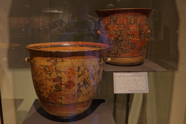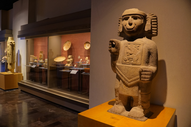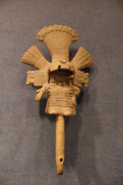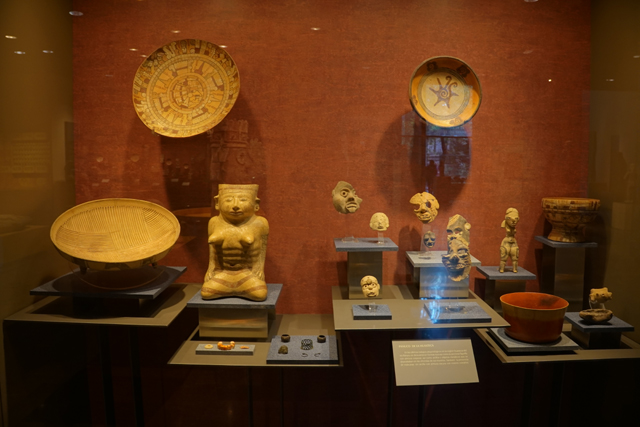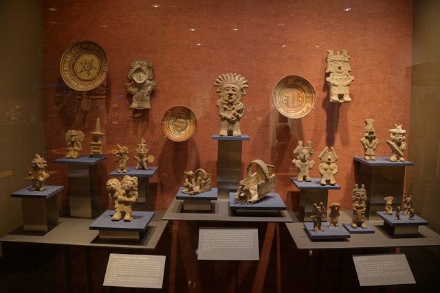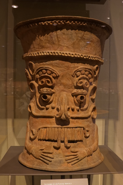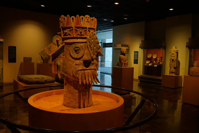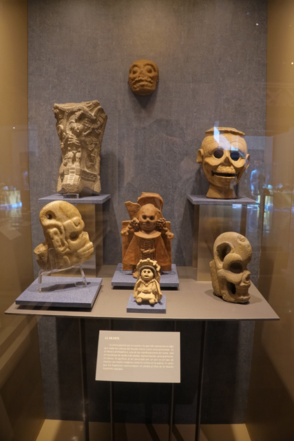 另側的展櫃介紹「托托納克」(Totonacs),它擁有世界文化遺產「El Tajín」,遺跡金字塔以繁多如窗的壁龕圍繞,頗具特色。我也曾想去踩點,可惜那兒一來一回便是兩天,我根本擠不出來。這邊展物則多來自其另個主城「Cempoala」,例如沙鈴、哨子這樣的小型樂器,神像跟祭司人偶自然是有,但沒「瓦斯特克」那樣精緻。較醒目的是死神祭殿的壁繪復原,其中層佈滿大量人頭浮雕,周邊畫上不同紋路的圓盤。根據說明板,有芒線者為日、嵌入燧石刀的代表月、附加四小環的則是金星。