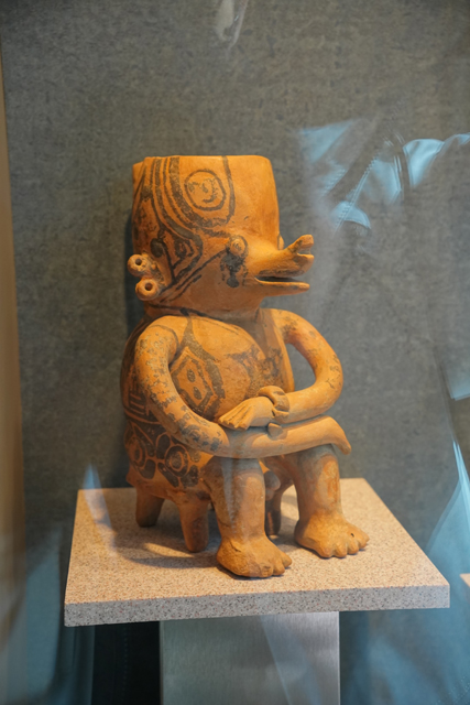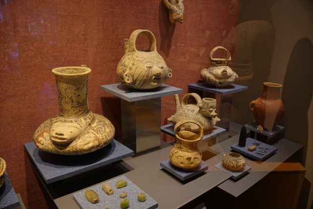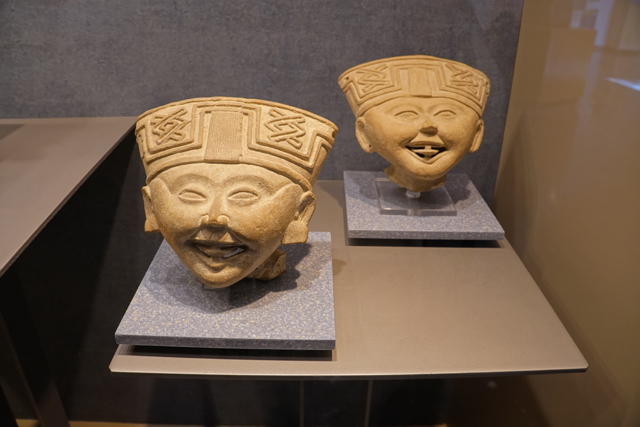館裡收藏的「大頭」不只一個,在陶偶展櫃間便有同樣來自「聖羅倫索」的兄弟,宛如眾星拱月。其模樣相似,狀況卻異常好,沒像前一位歷經風霜,孔洞處處。鄰近尚有此城不同風格的大型作品,一尊雙手抱膝,臉部結合了美洲豹特徵,另者則被名為「摔角手」,因著像是勒脖的壓制姿勢。