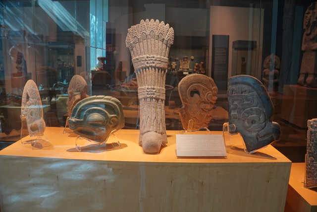轉至隔壁廳,這兒幾櫃頗特別,乍看像只為展現雕工的擺飾,但查了資料,應有宗教用途。它們分成三類,以球員裝備為發想。「Yugos」是護具,像石質馬蹄鐵較不吸睛。「Hachas」仿擬斬下被獻祭者頭顱的石斧,也因此除了鷹、豹,多雕成人的側臉。豎長的「Palmas」相對抽象,有的似箭綑,如棕櫚葉揚散,有的專注展現手藝,在流曲刻紋間浮透人像。這樣的設計很令我疑惑,儀典時真會配穿石質「Yugos」,雙手各拿「Hachas」跟「Palmas」嗎?還是當祭壇擺設?