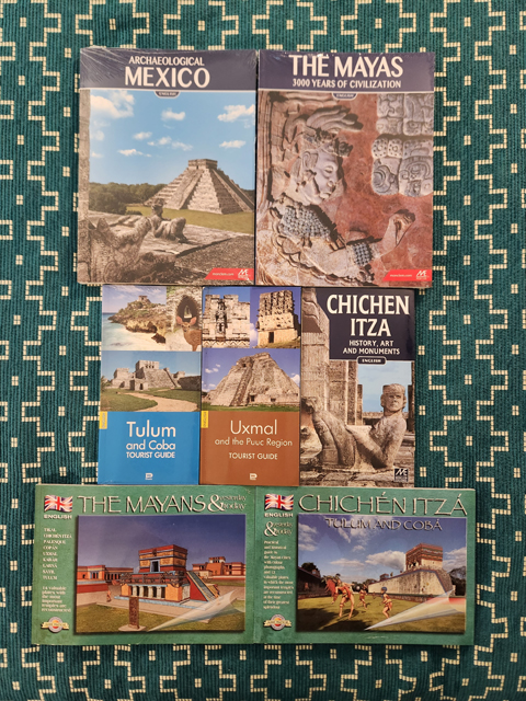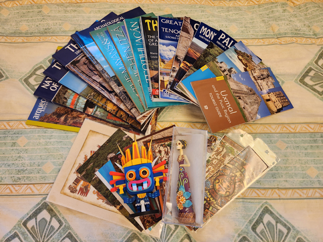 疾速穿出,拐進店,團員顯然都已大肆掃完貨,進入結帳階段。經過一圈環視,這裡果然如老師所述,各類型的紀念品皆有,且都滿精緻。我快手挑了幾張代表性的書籤明信片,走往書區,集合時間將屆自然沒空翻閱比較了,直接把英文版的中美洲文明書全搜刮,只要封面跟之前買的沒重複就好了,畢竟回台灣要找到相關書籍的機會微乎其微。然儘管老師曾吹捧這館的遺跡書是最多的,我來回掃瞄了幾次卻沒看到「提卡爾」,只有墨西哥的遺址,這很令我黯然,前幾天在當地沒買到,唯一的寄望只有這裡啊,到底這館是自私還是怕越界會被告?