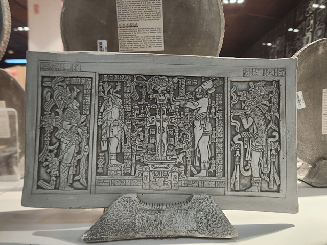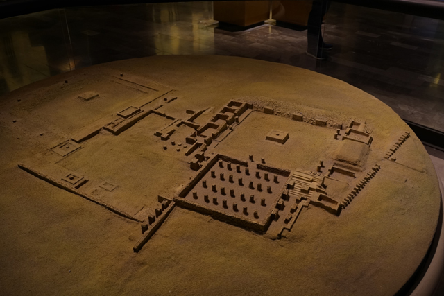 瀏覽過,推進至第十一館「墨西哥北部」,這館也滿大,偏偏時間所剩無幾,只能加快腳步。初始的部分從公元前八千年講起,所展器皿樸實,很合理全略過。接續以某遺跡模型為心,環繞文物亦與其有關,事後比對資料,似是一處儀式中心「Altavista」。它屬於「Chalchihuites」文化,五到七世紀為其發展頂峰,擁有完整的數字文字系統,除了宗教地位,也掌握綠松石之類的貿易路線。遺跡留存的「柱廳」頗有意思,二十八根殘柱可能對應著曆法週期。角度各異的迴廊立柱組成的「迷宮」同樣值得推敲,畢竟廊末剛好指向春分的日昇處。