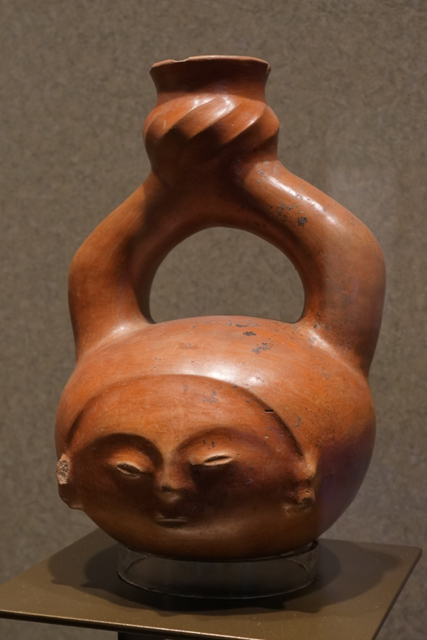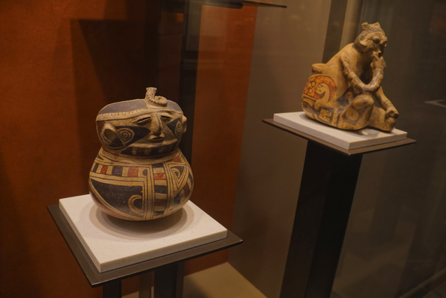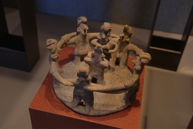 他們的製品很具特色,幾乎都會以赭黑顏料勾抹出圖騰,似渦流如閃電,某些據說象徵生育力。這之間有不少捏出獸首的壺,外型雖像想走兇猛路線,小眼珠點上,或嘴一噘,就走鐘成愣呆。類似的笑點也出現在人偶,根據說明板,男性會將頭髮往後梳,女性有瀏海,展櫃卻只有一個個小胖子,從身體到頭頂都滿滿紋繪。他們喜歡用小手撐著臉頰下巴,彷彿是想表達思索,搭上五官,情境就變了,有的像「這東西好好吃啊,呵呵呵」,有的像「完蛋,等一下要被揍了」,就別提那些雙眼失焦,根本在放空的,一路笑著看去的我,都不知他們是手滑的成果,還是工匠精準的呈現。
