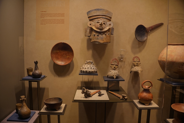 除了人偶,雕塑另有一大類是微縮建築。按照考據,他們房屋應是以石為礎,往上築起內襯泥土的蘆葦牆,再蓋上茅草屋頂。微縮建築亦似模似樣,某些可能還是小神殿,高踞於階台,配襯迷你石碑。彷彿就算死後,也要還原生前世界。相搭的儀式場景同樣具體而微,能見樂手舞者們彼此簇擁。而根據說明板,「哈利斯科州」的「Teuchitlan」文化尚有特殊的「Guachimontones」。雖像馬雅人那樣將屋殿築於階台,圍繞廣場,卻是環形佈局,中央階狀祭壇亦呈圓錐。且由於地緣,被世遺「龍舌蘭景觀和古代龍舌蘭酒工業設施」順道收入。