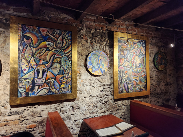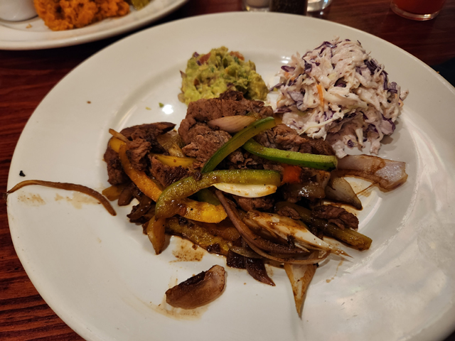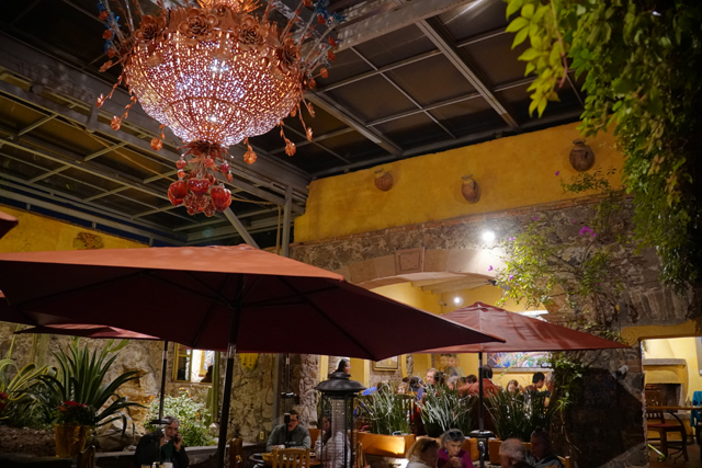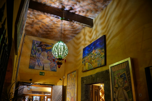 車途迢迢,抵達旅館已很晚,為了節約大夥覓食的摸索,領隊先訂了一家評價不錯的餐廳「Hecho en México」。餐廳門面不算醒目,裡頭卻別有洞天,中庭改裝成庭園座席,花綻形樣的華麗吊燈掛懸,包廂裡,帶有抽象元素的現代畫在牆上點綴。盯了菜單許久,我最後選了「Fajitas」烤肉。上桌後不愧其評價,沒有肉腥,調味也挺不錯。