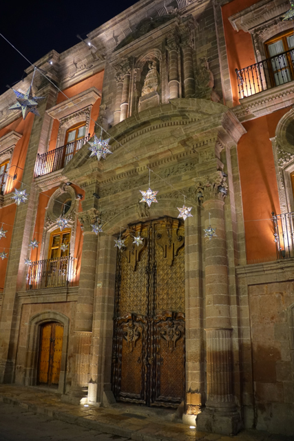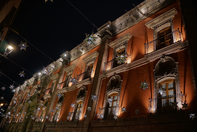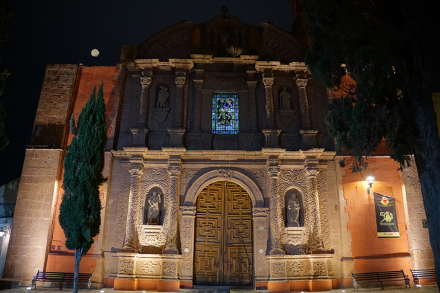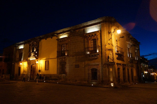 吃完後跟著大夥朝鬧區走,沒多久便有經過打光的高塔拱頂剔亮夜空,本以為就是城區最主要的教堂,比對地圖卻是另座「聖母無染原罪教堂」(Church of the Immaculate Conception),正主還未到。在此往東拐,僅以素色刷漆的民宅間,突有一棟拔高為三層,窗台皆飾著雕框,並以附加龕室的弧頂大門揚展氣勢。它在地圖被標為「Casa de Cultura Banamex – Casa del Mayorazgo de la Canal」,名字挺長,但只是歷史演變使然。最初它屬於有錢的「Canal」家族,為市長官邸。卻在獨立戰爭被保皇黨軍隊佔領,並遭洗劫,幾次轉手後,才由墨西哥國家銀行接手,化生為博物館。