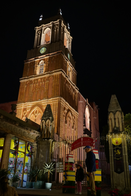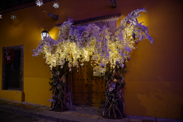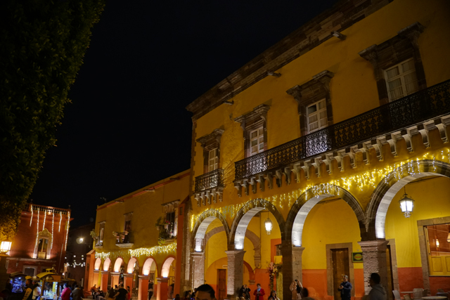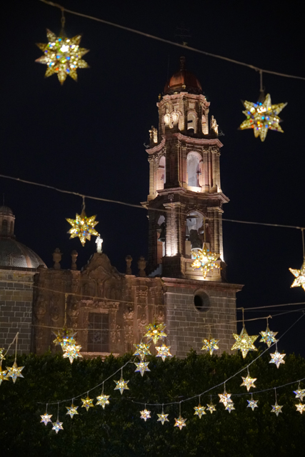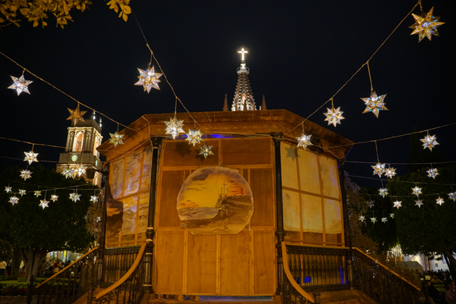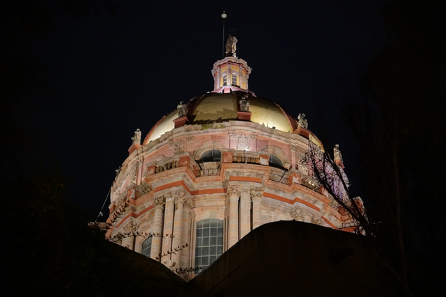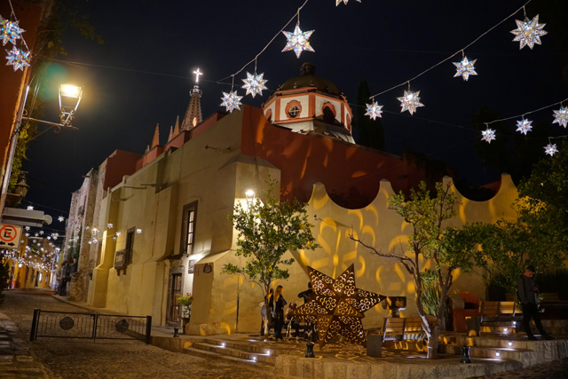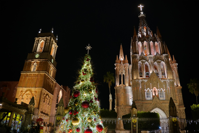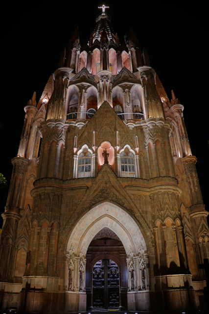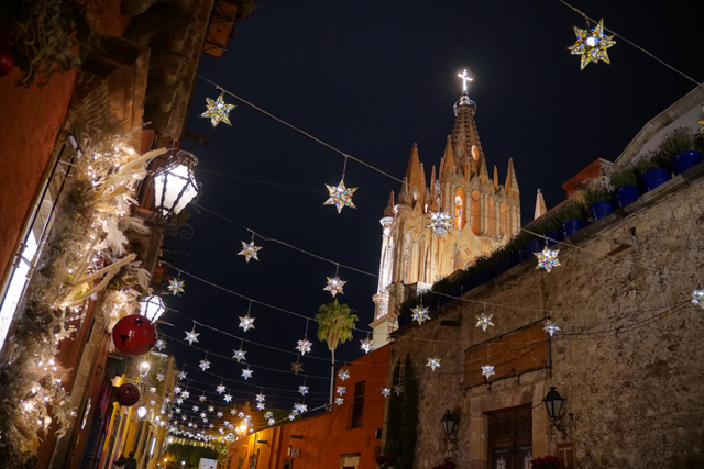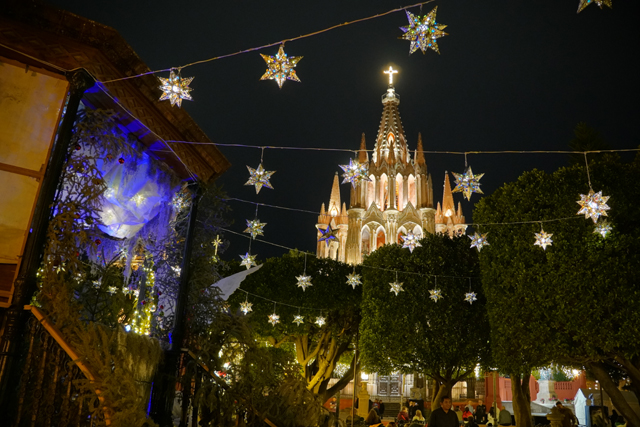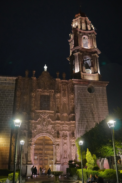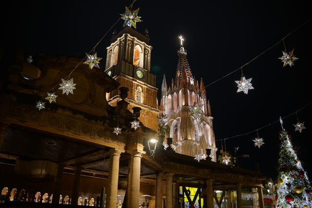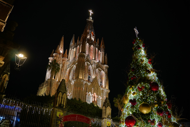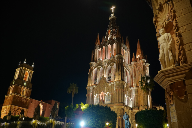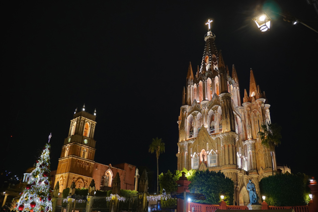 而在抬望過雕琢後,便來到被稱為「阿連德花園」(Jardín Allende)的主廣場。南側以多層次錐塔簇擁拔尖的立面輝亮著,標記城市的信仰核心。這就是介紹文多會提及的「大天使米迦勒教堂」(Parroquia de San Miguel Arcángel),它建於十七世紀,目前的樣貌為十九世紀的改動,據說建築師「Zeferino Gutiérrez」自學成材,沒去過歐洲的他僅憑哥德式教堂照片為發想,竟催生出這樣的傑作。儘管看不清細節,光照的輪廓便顯著華麗感,與鄰近的另個鐘塔、聖誕樹起伏勾勒,宛如只乍現於夜裡的幻惑光城。