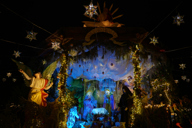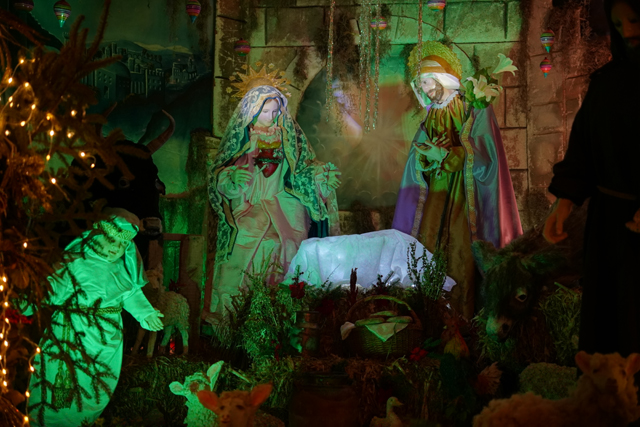 按過快門,不免也隨民眾在主廣場逛晃,一路走來,不少街巷都掛著爍亮的星芒燈籠,而它們似都匯聚於此,和如螢般的燈點相互烘托。居中的八角亭被填入了造景,枝葉為襯、牛羊圍擁,在雙親的盯望下,搖籃正等待明晚主角的到來。