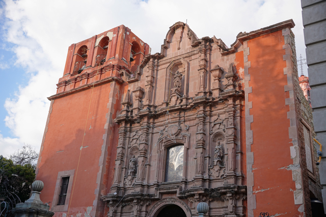 其立面明顯又是「Churrigueresque」風格的展演,以瓣緣門拱為心,左右有經典的倒錐形飾柱「Estipite」,再往旁的龕室似捲蕨亦如浪花。這之間可見眾多人像,或綴於柱尾、或藏在藤葉、或於花芯探首、或在龕室守望。立面上段尚有螺旋底座支起的人像柱,身軀纏帶交錯。