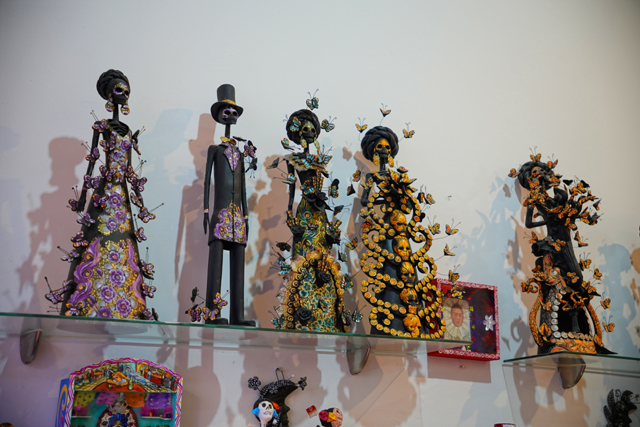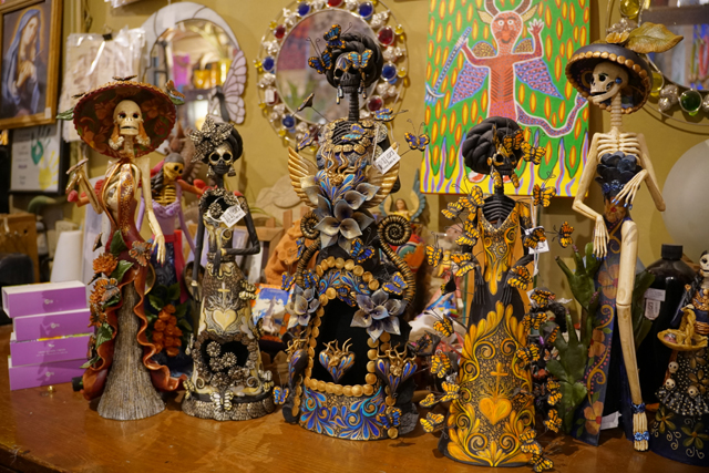逛了一圈出來,商家也陸續睡醒,包括一間昨天讓我停下步伐的藝品店。當時被櫃架上的幾位骷髏女吸住目光,這回近距細看更覺精緻。她們穿著暗紅寶藍的晚禮服,衣紋金爍,從帽髮到裙襬都鑲綴繁花或彩蝶。可惜超貴啊,而且顯然很脆弱,帶回家應該哪裡就斷了吧。