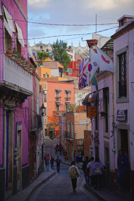 收集了這兩間,鄰近似乎沒其他較具規模的教堂,就拐去了「接吻巷」。一如預想,巷內跟昨天的人山人海大相逕庭,得以讓我捕捉清爽的畫面。其他三個女生剛好也在此,請她們幫拍後,便一起往「瓜納華托聖母聖殿」方向走。