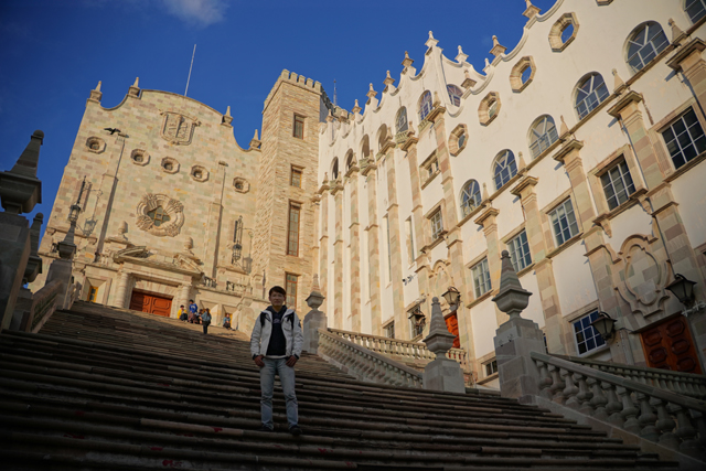 再過去就是「瓜納華托大學」了,在山丘眺望便已顯巨大的它,近看更展威儀。且它也不是徒具量體,頂簷如浪,小飾塔頻繁挑飛,列窗隨層變換著模樣,西側還舖設了大廣階,直指以飾框妝點的禮堂立面。然這設計雖彰顯了氣勢,超過百階根本在整學生,也令厭爬的我看了就腿發痠。在大夥齊同中了定身咒的景況下,只有老師興奮跑上去摸了門,似乎是因導遊說摸了會All pass之類。但話說回來,「老師你還需要考試嗎?」